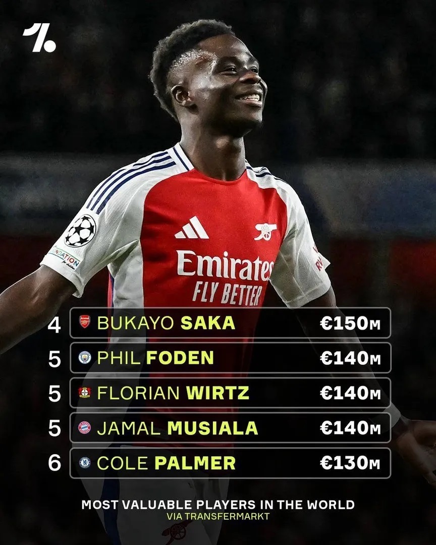 بوکایو ساکا مهاجم انگلیسی آرسنال با ۱۵۰ میلیون یورو در رده چهارم قرار دارد و ستاره هایی چون فیل فودن، فلورین ویرتس، جمال موسیالا و کول پالمر در رده های بعدی قرار دارند.