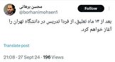 محسن برهانی، استاد گروه حقوق دانشگاه تهران که سال گذشته از تدریس در این دانشگاه محروم شد، در شبکه اجتماعی ایکس از بازگشت خود به دانشگاه خبر داد.