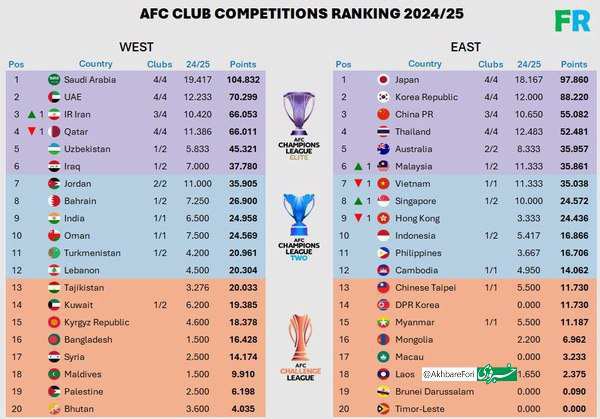 بر این اساس ، با استقلال هشتم لیگ نخبگان و تراکتور به چهارم نهایی لیگ قهرمانان آسیا ، امتیاز فوتبال ایران به ۶۰۰۰ افزایش یافت تا به پنجم در آسیا برسد.