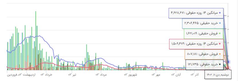 نمودار زیر حجم معاملات خرید و فروش را که توسط افراد و اشخاص حقوقی تقسیم شده است ، در هر روز معاملاتی نشان می دهد که در کل ۶۸۵،۰۰۰ سهم توسط افراد خریداری شده و ۶۸۵،۰۰۰ سهم توسط اشخاص حقوقی فروخته شده است. حجم معاملات زیاد در نمودار بدان معنی است که احتمال شروع روند جدید وجود دارد ، در حالی که حجم معاملات پایین نشانگر عدم تمایل معامله گران به تجارت این سهام است. در صورت افزایش قیمت ها و افزایش حجم معاملات، این نشانه تایید روند صعودی سهام و بالعکس است.