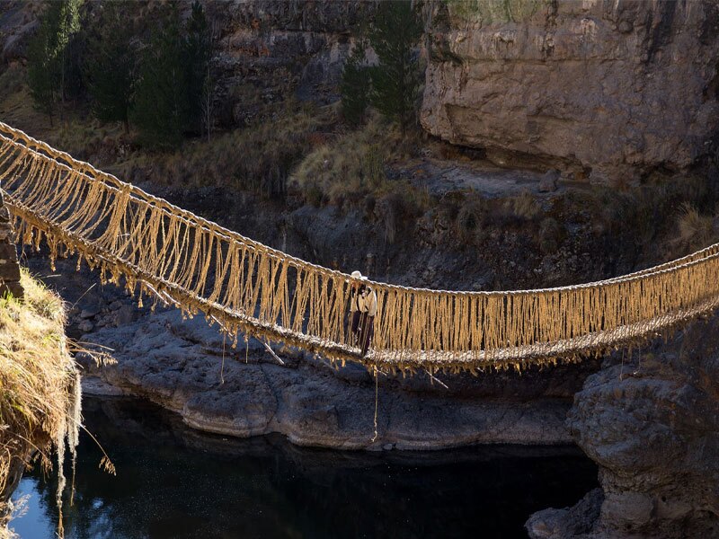 برای بازسازی پل طنابی اینکاها، روستاییان هر طرف رودخانه دست به کار شده و یک رشته طناب به طول چند صد متر به قطر ران یک مرد بالغ می بافند و در طول این پل نصب می کنند. .