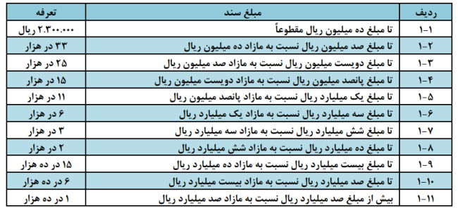 ضرایب مربوط به حق التحریر قراردادهای خصوصی موضوع ماده ۲ قانون الزام به ثبت رسمی معاملات اموال غیرمنقول با توجه به تغییر منبع محاسبه به نحوی تعیین خواهد شد که نتیجه محاسبه معادل باشد. حق چاپ مندرج در تمام ردیف های بند ۴ این تعرفه.