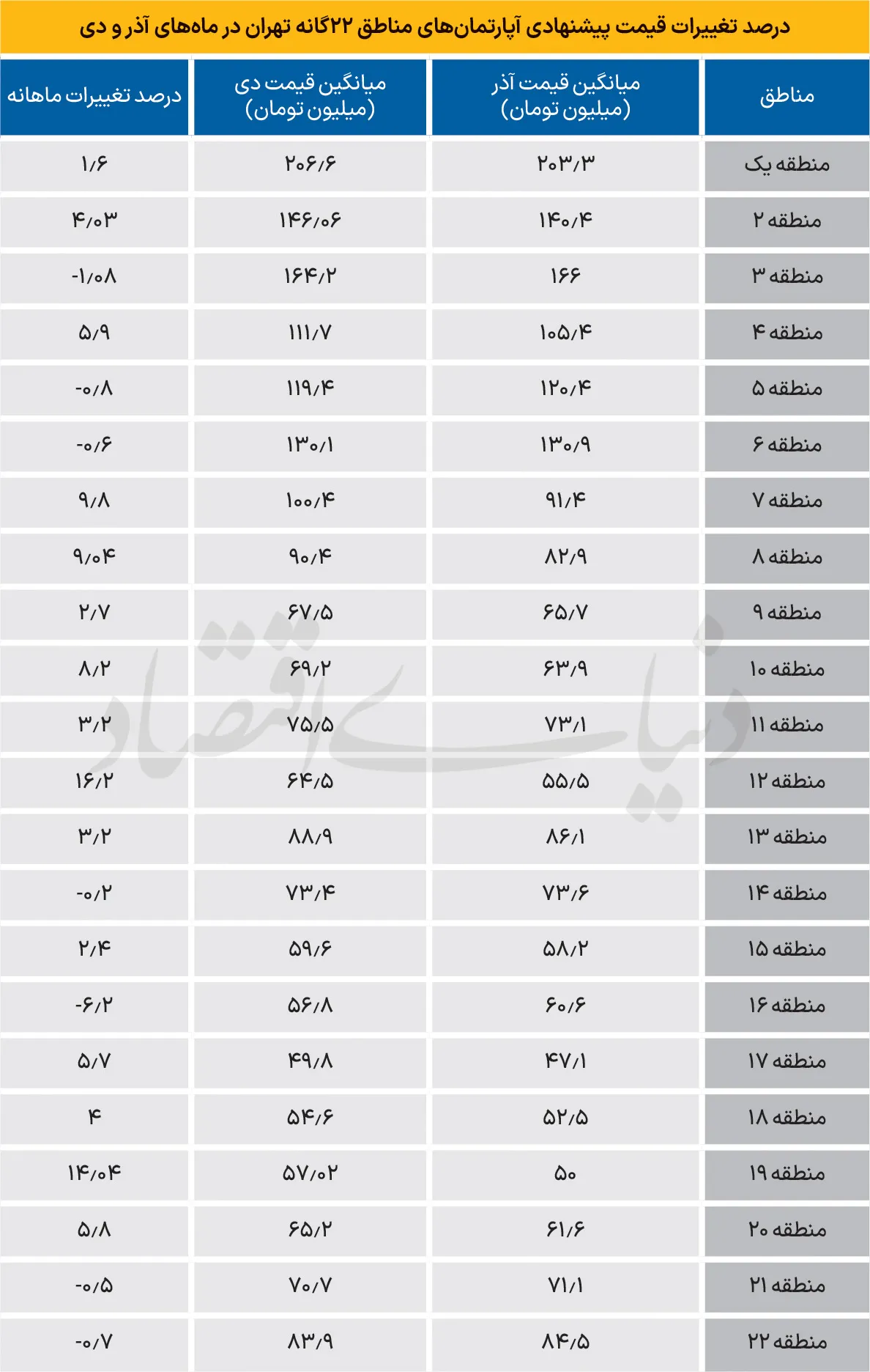 طبق اخبار تجاری ، بازار املاک و مستغلات در دی این ماه هنگام خرید سرمایه با دو عامل “دین و ارز ترامپ” با حرکات ملموس روبرو است. این منجر به میانگین قیمت پیشنهادی برای واحدهای مسکونی در مناطق منتخب دو منطقه با افزایش ۳.۵ درصد شد دی ماه در هر متر مربع به سطح ۱.۵ میلیون دلار می رسد ، در حالی که شکل آذر ماه ۱.۵ میلیون دلار در هر متر مربع بود.