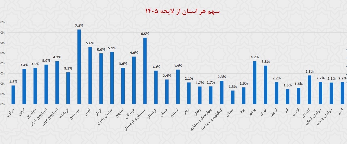 افق میهن، تحلیل سهم استان ها در لایحه بودجه سال ۱۴۰۵ نشان می دهد که خوزستان با ۷.۳ درصد از کل بودجه بیشترین سهم را در بین استان ها دارد. پس از آن استان های سیستان و بلوچستان با ۶.۵ درصد و فارس با ۵.۶ درصد به ترتیب در رتبه های دوم و سوم قرار گرفته اند.