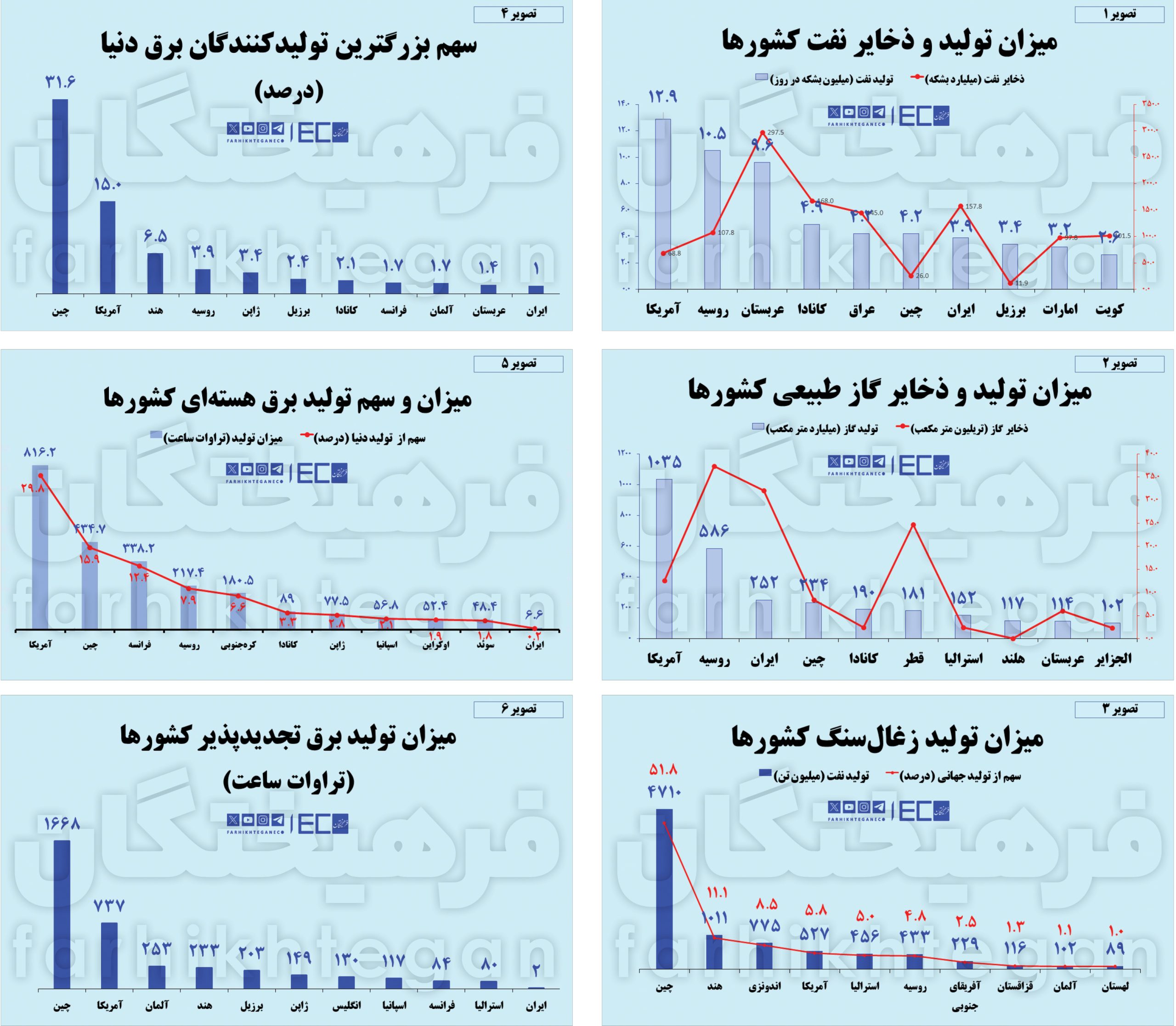 در مجموع بررسی تولیدکنندگان بزرگ انرژی در جهان در حامل های مختلف نشان می دهد که ایران در تولید نفت و میعانات گازی رتبه پنجم، در تولید گاز طبیعی سوم، در تولید منابع هیدروکربنی چهارم و در تولید رتبه یازدهم را دارد. از برق