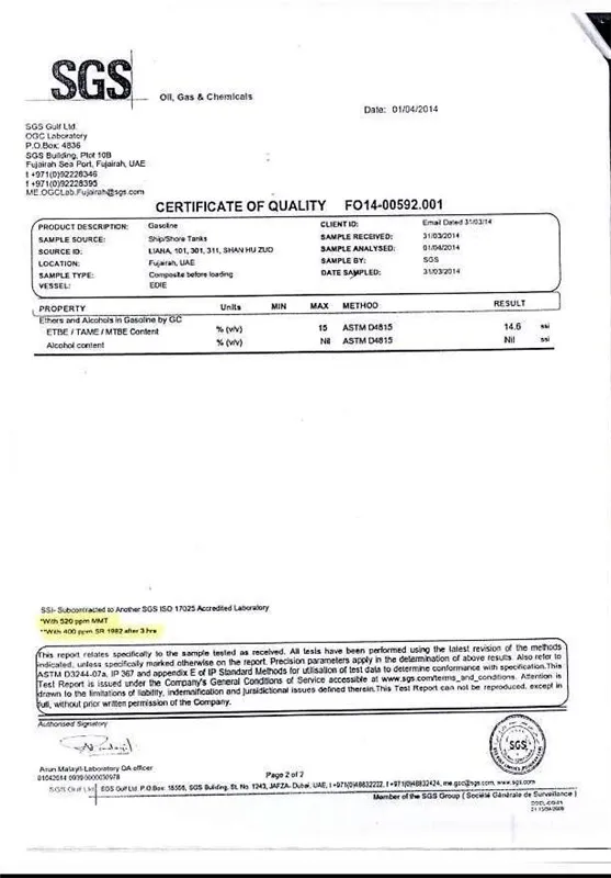 در همان زمان ، سندی وجود داشت که در آن حمل و نقل وارداتی هم یک MMT خطرناک و هم MBT بود. در این میان ، معاون وزیر نفت آن زمان MBT تهدیدی را برای سلامتی در نظر نگرفت و فقط قصد توضیح وجود MMT در حمل و نقل را داشت.