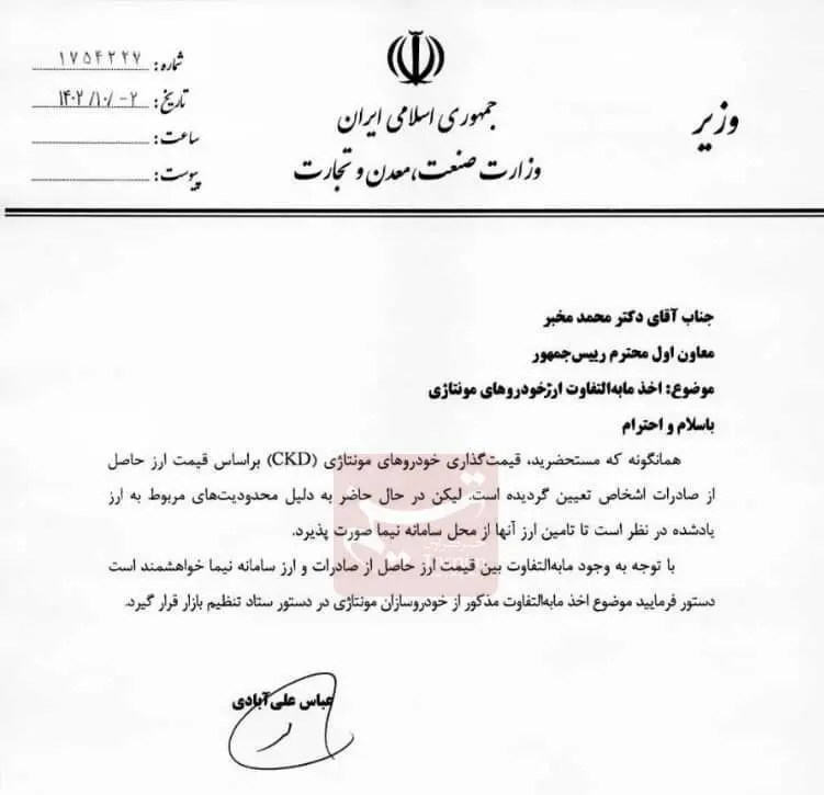 با توجه به وجود تفاوت قیمت ارز حاصل از صادرات با ارز سامانه نیما، دستور میرسد موضوع اخذ این مابهالتفاوت از خودروسازان مونتاژی در صلاحیت مرکز تنظیم بازار قرار گیرد.