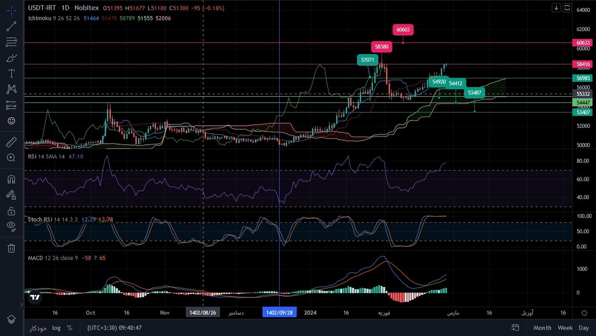 سومیا شورابی; بازار: امیدرضا قیرتی، کارشناس و تحلیلگر بازار مالی در تحلیل خود از دلار (USDT) توضیح داد: در تحلیل دلار در هفته گذشته پیش بینی می شد که تا ۵۸ هزار تومان افزایش قیمت داشته باشیم. در حال حاضر دلار در قلمرو اشباع قرار دارد و در حال حاضر به خط وسط کانال صعودی می رسد که ممکن است تا محدوده ۶۰ هزار تومان حرکت کند و سپس وارد یک اصلاح شود.