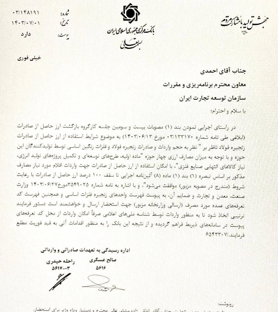 در اجرای بند (۱) مصوبات بیست و سومین جلسه کارگروه بازگشت ارز حاصل از صادرات ابلاغی طی نامه شماره ۰۳/۱۳۳۱۷۰ مورخ ۲۳ خرداد ۱۴۰۳ در خصوص شرایط استفاده از ارز حاصل از صادرات زنجیرههای فولادی، حجم واردات و صادرات زنجیرههای فولادی و فلزات غیرآهنی اساسی توسط تولیدکنندگان این منطقه و متناسب با سطح هزینههای ارزی چهار حوزه اصلی مواد طرحهای توسعه و تکمیل است. از پروژه های تولید انرژی، نیاز به کالاهای قابل اشتعال صنایع فلزی با امکان فوق الذکر هزینه های لازم برای واردات ارز حاصل از صادرات می باشد. به استناد تبصره (۱) بند (۱). بر اساس ماده (۸) آیین نامه اجرایی، حداکثر تا ۱۰۰ درصد ارز حاصل از صادرات با رعایت شرایط مندرج در مصوبه فوق و با استناد به نامه شماره ۳۵۴۹۰۲۵ مورخ ۷ خرداد ۱۴۰۳ موافقت می شود. وزارت صنعت و معدن و بازرگانی و ضمائم به فهرست واحدهای زنجیره فلزات اساسی و فهرست شمارههای تعرفه اصلی گمرکی که برای دعوت توسط وزارت مذکور ارسال میشود، پیوست میشود. لطفاً دستور دهید که برای این منظور از طریق شناسههای ملی، فقط امکان واردات از محل کد، توافق مناسبی انجام شود. تعرفه های ضمیمه در سامانه های مربوطه ارائه شده و نتیجه برای اقدامات آتی سریعاً به اطلاع بانک می رسد.