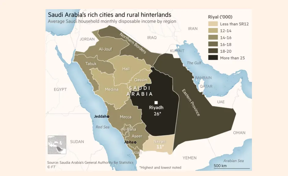 با این حال ، شکاف های زیادی بین ریاض و مناطق دیگر وجود دارد. طبق یک نظرسنجی ایالتی که در سال دوم منتشر شده است ، میانگین درآمد ماهانه یک خانواده در RIAD 4000 ریال (۱ دلار) بود. بیش از دو برابر نجفان ، یک استان کوچک در شرق ASIR. بیکاری همچنین الگوی مشابهی دارد: نرخ بیکاری در سرمایه تنها نیمی از میانگین ملی است.