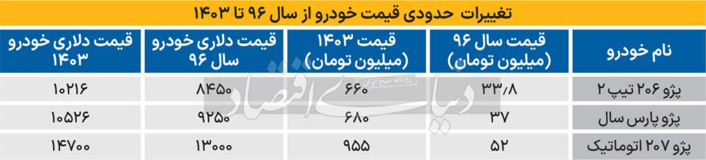 «دنیای اقتصاد» قیمت دلاری سه محصول پرطرفدار داخلی یعنی پژو ۲۰۶ تیپ ۲، پژو پارس سال و پژو ۲۰۷ اتوماتیک را از سال ۱۳۹۵ برای بررسی رشد قیمت خودرو زیر ذره بین قرار داده است. پژو ۲۰۶ تیپ ۲ در سال ۱۳۹۵ ۳۳ میلیون و ۸۰۰ هزار تومان قیمت داشت. در آن سال قیمت دلار در بازار آزاد حدود چهار هزار تومان بود. بنابراین قیمت دلاری این خودرو در آن سال یعنی تنها یک سال قبل از شروع تحریم های ثانویه که منجر به تورم در کشور شد، ۸۴۵۰ دلار بوده است. در این مدت قیمت دلار رشد چشمگیری داشته و از ۴۰۰۰ تومان در سال ۱۳۹۵ به ۶۴ هزار و ۶۰۰ تومان رسیده است که قطعا تاثیر بسزایی در قیمت خودرو داشته است. اما رشد قیمت خودرو بیش از این مقدار است به طوری که قیمت دلاری پژو ۲۰۶ تیپ ۲ در روز گذشته ۱۰ هزار و ۲۱۶ دلار بود که نشان دهنده افزایش ۲۰ درصدی قیمت دلار است.