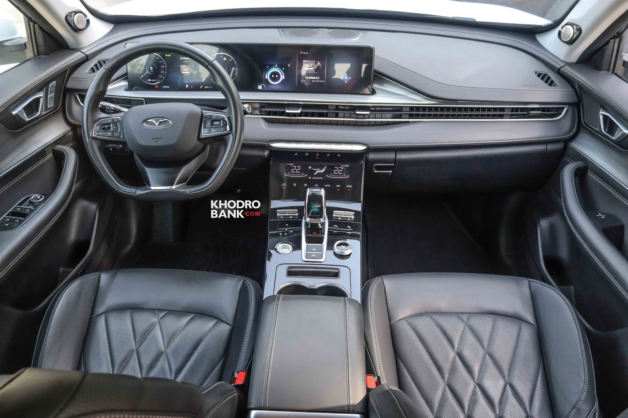 برخلاف ظاهر خارجی، نمای داخلی فونیکس تیگو ۸ پرو e+ نیز نسبت به نسخه های داخلی تغییرات بیشتری داشته است. پانل های ابزار دو عرض هنوز هم اکثریت داشبورد این خودرو را تشکیل می دهند. دکمه های زیادی در داخل خودرو وجود ندارد و بیشتر تنظیمات از طریق لمس انجام می شود. پنل لمسی سیستم تهویه که در تیگو ۸ پرو دیدیم در نسخه هیبریدی حذف شده است و احتمالا تنظیمات سیستم تهویه از طریق نمایشگر و دکمه های کوچک انجام می شود. علاوه بر این، چینش دکمه های کنترلی در مرکز کابین تغییر کرده و به جای دکمه های پیانو شاهد دکمه های تخت نقره ای هستیم. البته نسخه عرضه شده در ایران از تریم دو رنگ قهوه ای و مشکی بهره خواهد برد. پنل تهویه هشت اینچی نیز در جای خود قرار دارد.