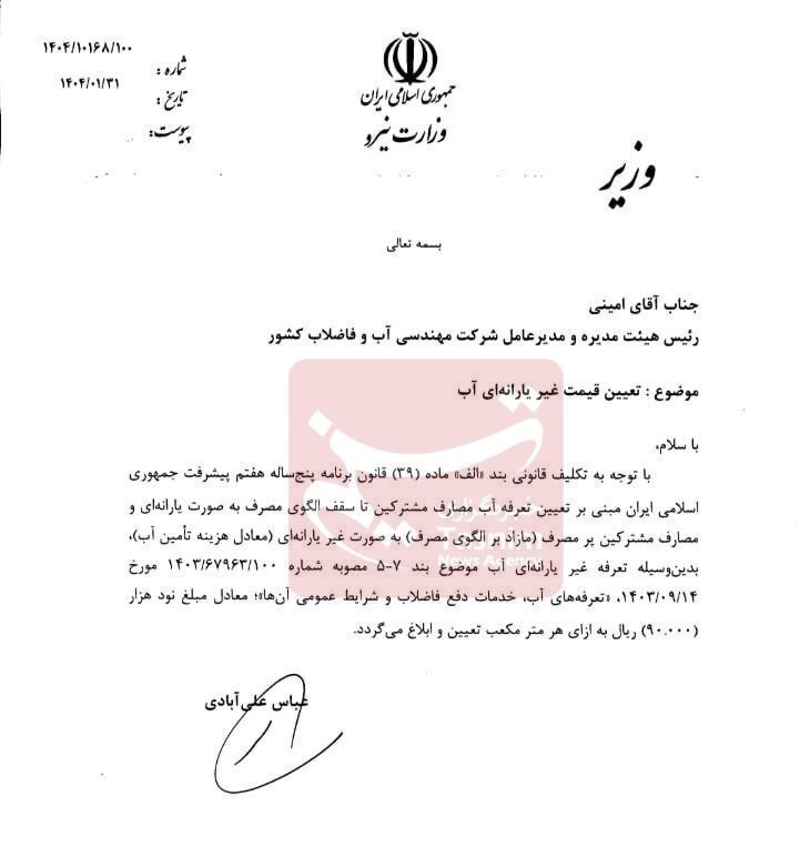 با تأیید افزایش آب و میانگین تعرفه در تعرفه برای مشترکانی که بیش از ۵ برابر الگوی مصرف می کنند ، قیمت غیر آب برای مشترکین سوء رفتار با قیمت ۱ دلار در هر متر مکعب اعلام شد.