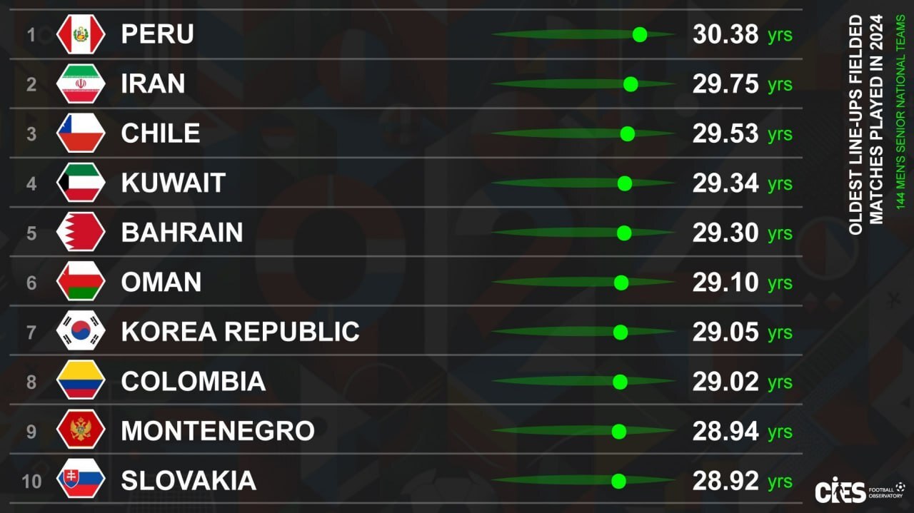 بر اساس این نظرسنجی، تیم ملی ایران با میانگین سنی ۲۹.۷۵ سال دومین تیم مسن جهان در سال ۲۰۲۴ است! پرو با میانگین سنی ۳۰.۳۸ سال در این رده بندی پیشتاز است و تیم های ملی شیلی و کویت در رده های سوم و چهارم قرار دارند.