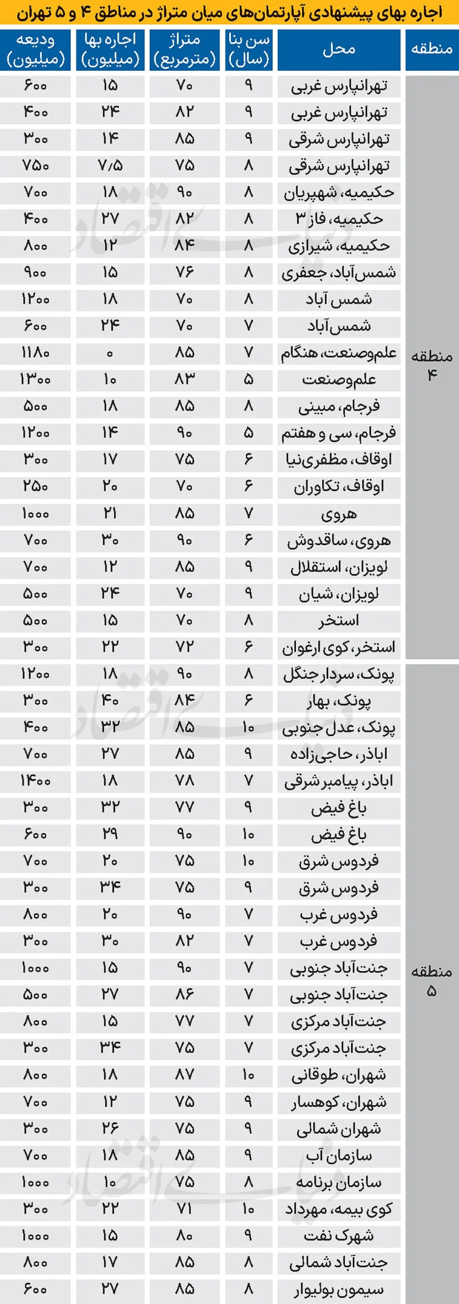تحقیقات میدانی نشان می دهد که میانگین “قراردادهای اجاره پیشنهادی” این دو منطقه در ابتدای سال در فروردین به ۱.۵ میلیون اجاره ماهانه و ۱.۵ میلیون دلار رسیده بود. این نشان می دهد ۵ ٪ تغییر در اولین بازار اجاره خرداد در مقایسه با فروردین در حقیقت ، روند بازار اجاره در دو ماه اول با تغییر زیادی همراه نبود و ثبات نسبی داشت. البته پیش بینی ها هر سال نشان می دهد ، احتمالاً از ابتدای فصل انتقال در پایان فصل انتقال. خرداد بگذارید تغییراتی در این بازار مشاهده کنیم. نکته قابل توجه در بازار بازار این دو منطقه ، نزدیک شدن به میانگین “سپرده پیشنهادی” ولسوالی (تقریباً ۲ میلیون دلار) در منطقه ۲ (۱ میلیون) Tomans است. با این حال ، میانگین “قراردادهای اجاره ای پیشنهادی” در منطقه ۲ ۱.۵ میلیون تومان در هر ماه است و در منطقه ۲ با ۲.۵ میلیون اجاره اجاره ماهانه Tomans برای مستاجران مطابقت دارد. با توجه به پرونده هایی که در دو منطقه ۱ و ۲ به بازار اجاره ارائه شده است ، بنابراین باید گفت که در منطقه شرقی تهران (منطقه ۱) مقدار قابل توجهی از امواج در این دو منطقه تمایل به حفظ پول بیشتر و اجاره ماهانه کمتر است و در منطقه غربی پایتخت (منطقه ۱) ، ترمیم ماهانه اجاره را افزایش می دهد.