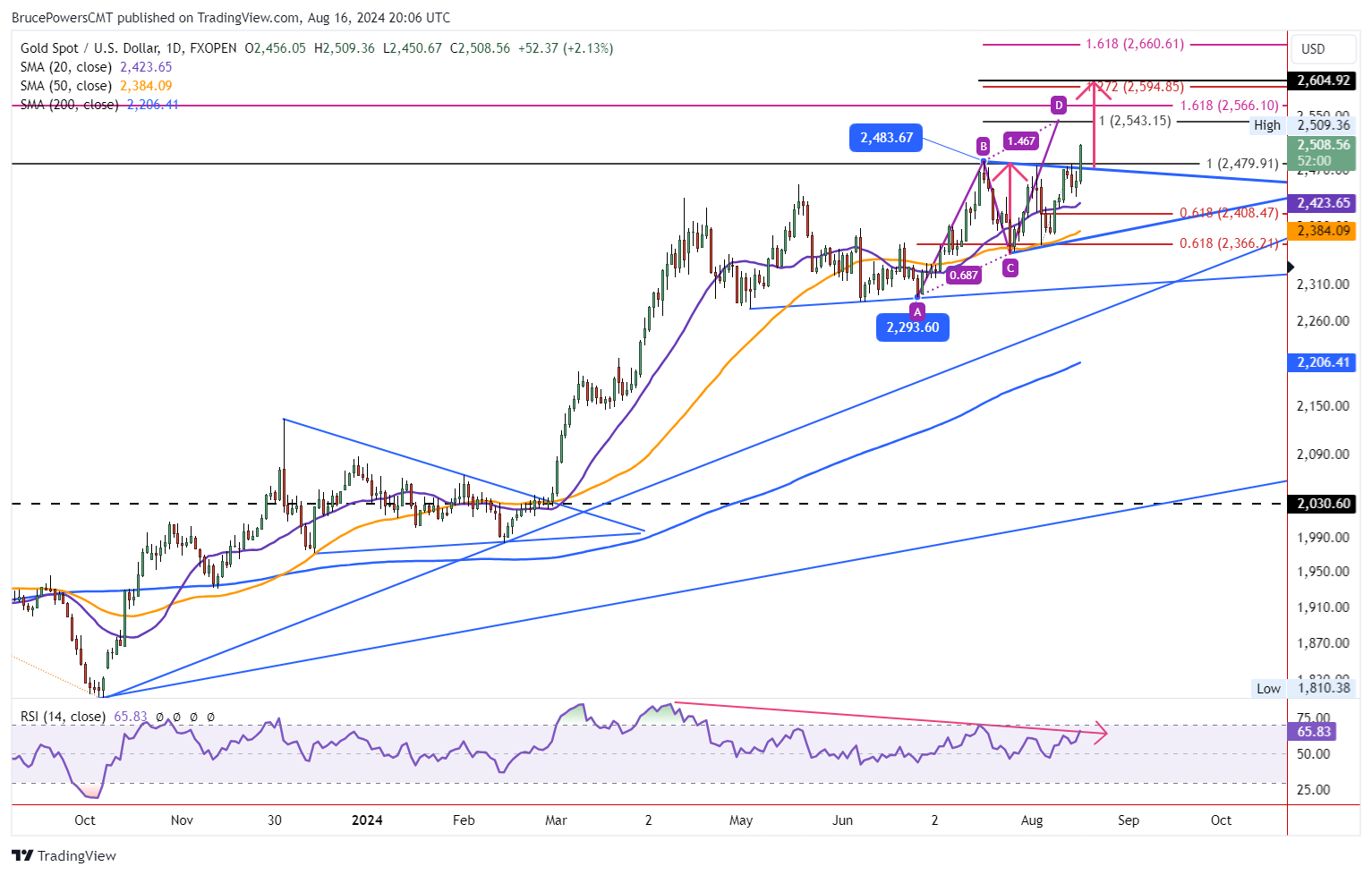 نکته بعدی که از نمودار بالا مشخص می شود این است که هدف بلندمدت بعدی قیمت طلا ۲۶۰۵ دلار خواهد بود اما هدف میان مدت سرمایه گذاران ۲۵۴۳ دلار خواهد بود. پس از آن، مقاومت بعدی طلا روی قیمت ۲۵۹۵ دلار آزمایش شد و در نهایت اگر بتواند مقاومت های فوق را پشت سر بگذارد باید منتظر افزایش قیمت تا محدوده ۲۵۰۶ دلار باشیم. مبنای این محاسبه این است که با در نظر گرفتن الگوی قیمت چهار بخشی (ABCD) که فاز اول آن از کف قیمتی سپتامبر ۲۰۲۲ آغاز شده است، می توان نتیجه گرفت که قسمت CD این الگو به قیمت اکتبر ۲۰۲۳ تعریف شده است. طبقه است