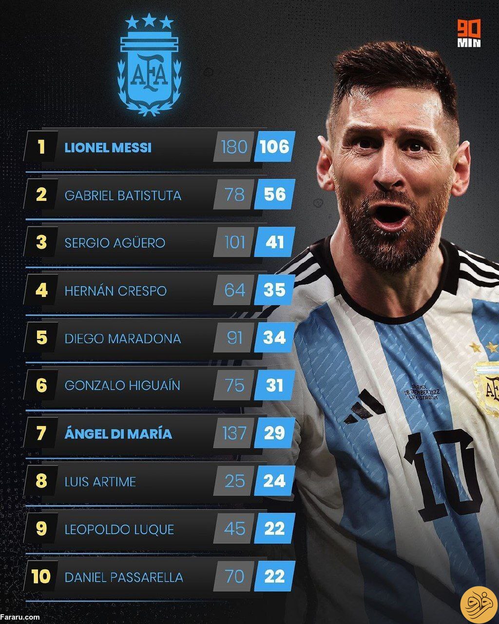 مسی با ۱۰۳ گل بهترین گلزن تاریخ فوتبال آرژانتین است و دیگو مارادونا در رده پنجم قرار دارد.