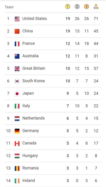 چین نیز با ۱۹ طلا، ۱۵ نقره و ۱۱ برنز به مقام دوم سقوط کرد. فرانسه میزبان با ۱۲ طلا، ۱۴ نقره و ۱۸ برنز همچنان در رده سوم قرار دارد.