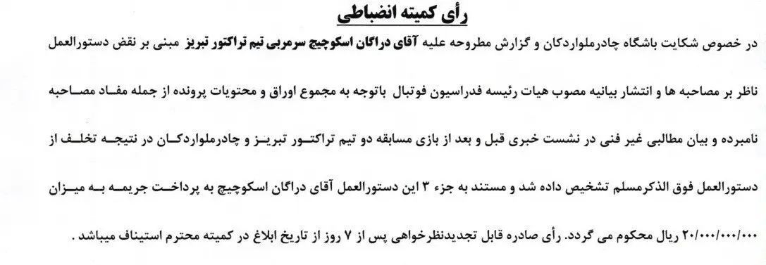 رای شکایت باشگاه چادرملوردکان به نفع دراگان اسکوچیچ سرمربی تیم فوتبال تراکتورسازی