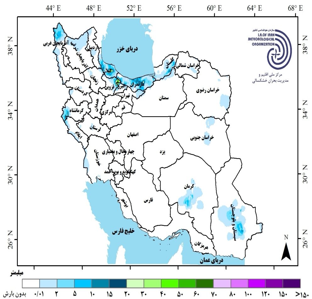 Khorasan شمالی ، Semnan ، Tehran ، Zanjan ، Ardebil ، East و West Azarbaijan و استان های کردستان بارندگی کمتری در بخش هایی از منطقه خود تا ۵ میلی متر و سایر استان های کشور داشته اند.