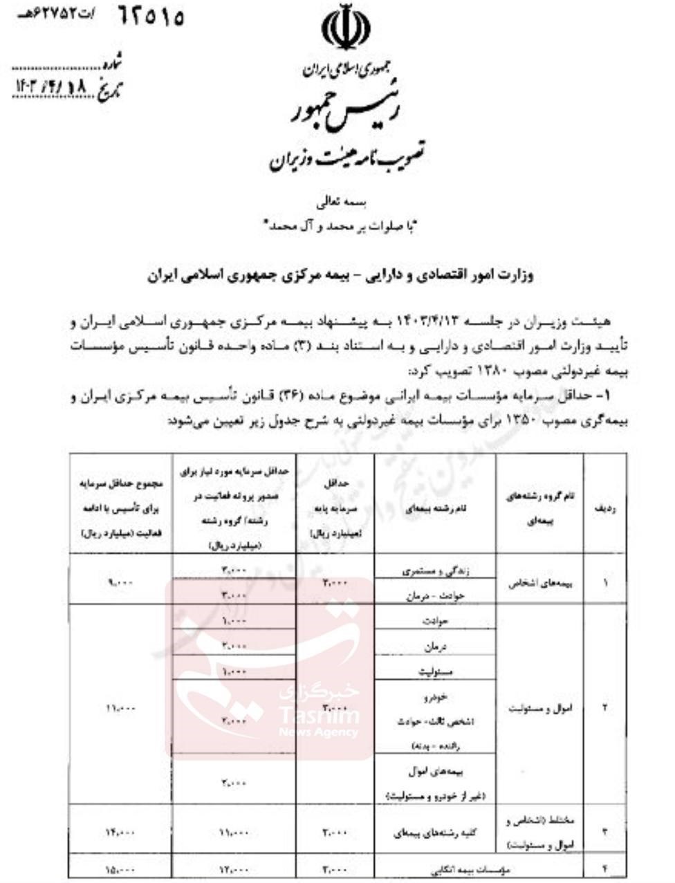 به گزارش افق میهن، مصوبه ۲۲ فروردین ۱۴۰۳ هیأت وزیران مبنی بر «تعیین حداقل سرمایه مؤسسات بیمه ایران طبق ماده ۳۶ قانون تأسیس بیمه مرکزی ایران و بیمه گران مصوب ۱۳۵۰». برای مؤسسات بیمه غیردولتی» با نامه شماره ۶۲۵۱۵ مورخ ۲۳ فروردین ۱۳۹۷ / محمد مخبر معاون اول رئیس جمهور اعلام کرد.