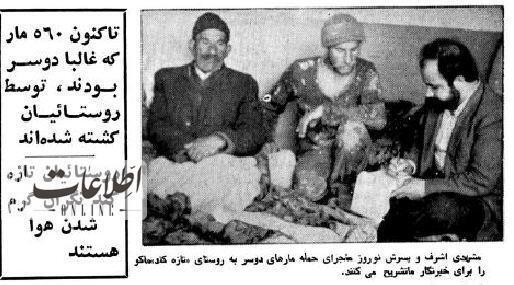 مارهای دو سر خانه های این روستا را احاطه کرده بودند. روزنامه اطلاعات ۵ خرداد ۱۳۶۳ گزارش میدانی این رویداد را منتشر کرد.