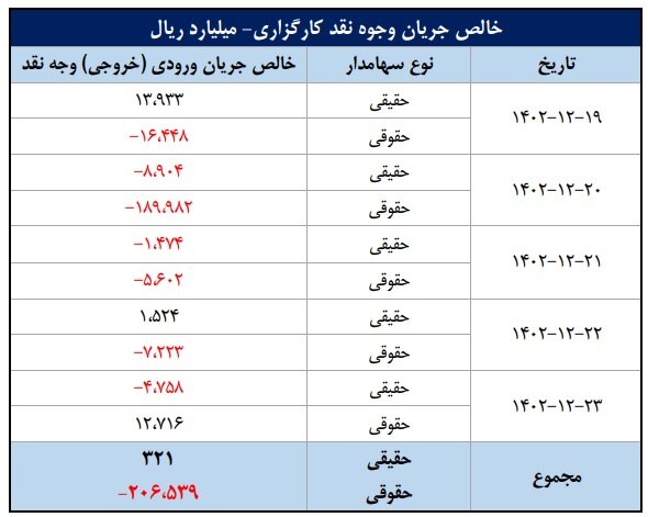 در هفته معاملاتی منتهی به هفته چهارم اسفند در این ماه، خالص ورودی وجوه کارگزاری برای اشخاص حقیقی ۳۲۱ میلیارد ریال بوده است.