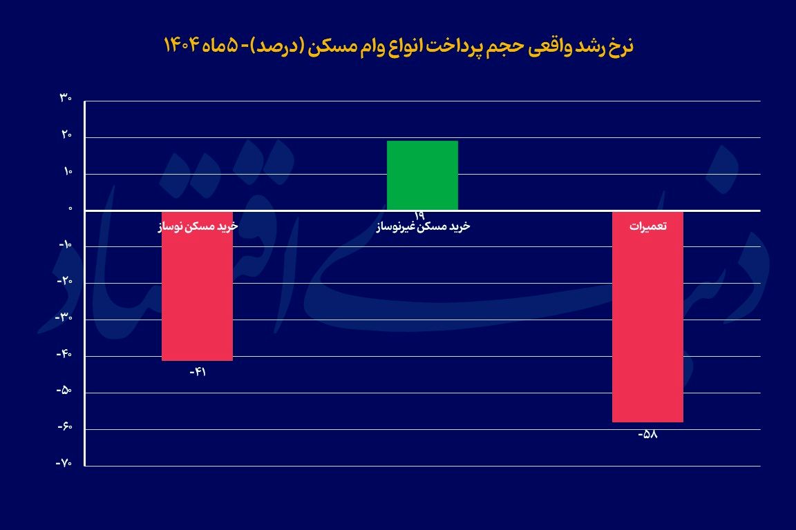 براساس گزارش بانک مرکزی ، کل تسهیلات پرداخت بانک ها در شش ماه اول سال جاری به ۴ تلاش رسیده است. در این دوره ، سهم کلیه مناطق مرتبط با مسکن کل تسهیلات بانکی حدود ۲ تلاش بود که ۴.۹ درصد از کل اعتبار بانکی پرداخت شده در این دوره بود. با این حال ، طبق ماده ۵ قانون تولید مسکن ، بانک ها و موسسات اعتباری غیر بانکی موظفند حداقل ۲ ٪ از تسهیلات سیستم بانکی را هر سال با نرخ بهره مصوب شورای پول و اعتبار اختصاص دهند. با این حال ، به استثنای دهه ۱۹۸۰ و اوایل دهه ۱۹۸۰ ، سهم بخش مسکن هرگز به ۵ ٪ نرسیده است ، در حالی که در سالهای اخیر سهم کل بخش مسکن به کمتر از ۲ ٪ کاهش یافته است ، به طوری که بخش جدید مسکن دیگر سهم جدیدی ندارد.
