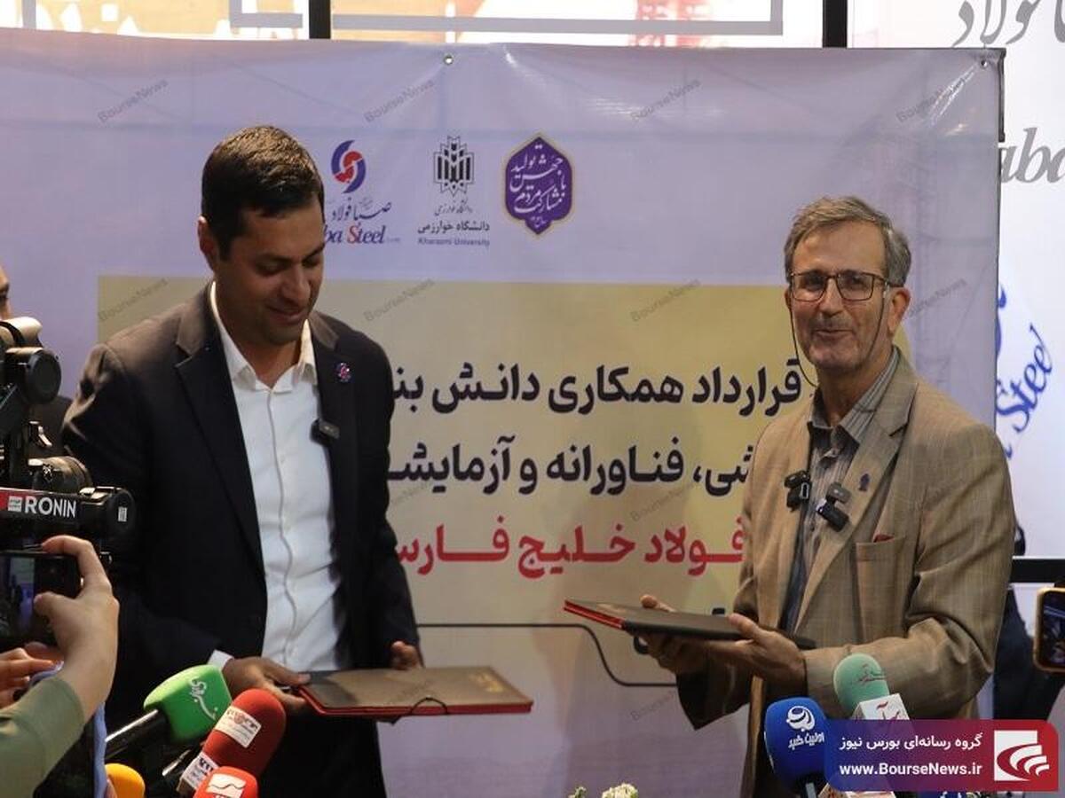 مراسم امضای تفاهم نامه همکاری های پژوهشی، فناوری و آزمایشگاهی دانش بنیان بین شرکت فولاد خلیج فارس صبا و دانشگاه خوارزمی تهران در نمایشگاه بین المللی متافو تهران برگزار شد.