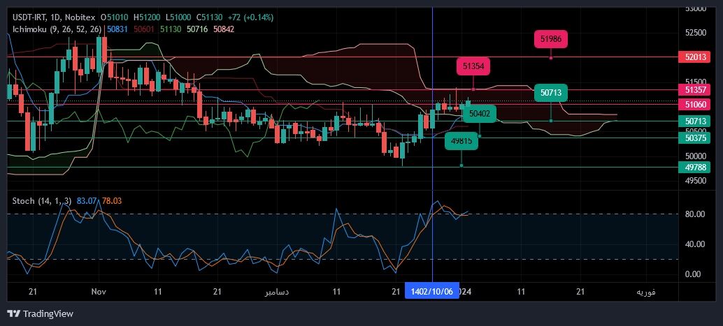 سومیا شورابی; بازار: امیدرضا قیرتی، کارشناس و تحلیلگر بازارهای مالی در تحلیل هفتگی دلار (USDT) توضیح داد: در تحلیل قبلی گفته می شد دلار به قیمت ۵۱ هزار و ۳۵۴ تومان می رسد که به نظر ما به این قیمت رسیده است. بسیار نکته و بازگشت انجام شد.