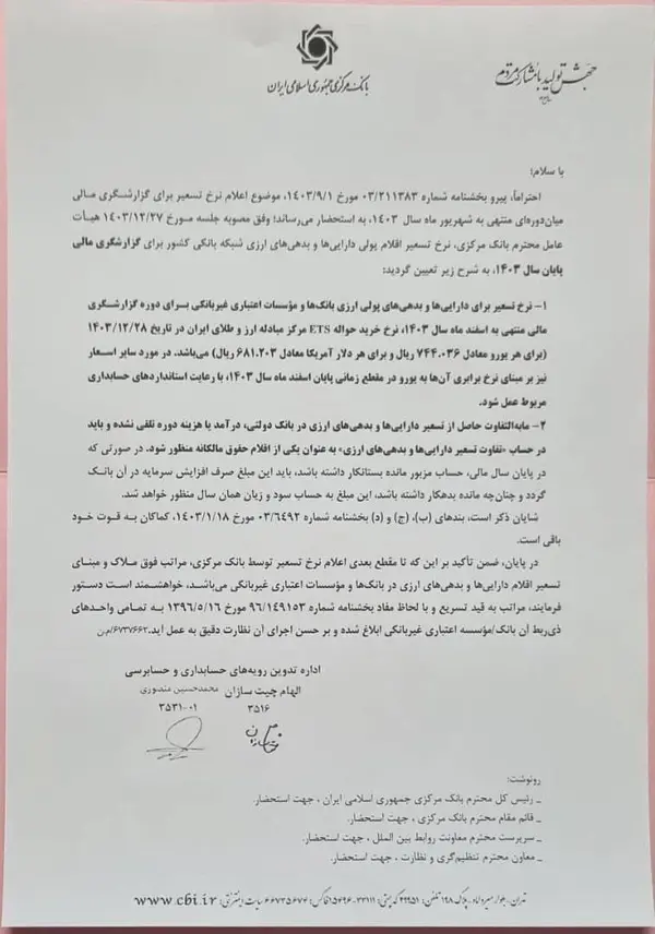 در نامه ای بر اساس جلسه هیئت مدیره بانک ، بانک مرکزی نرخ ارز ارز شبکه بانکی کشور را در پایان سال اعلام کرد. این نامه می گوید: