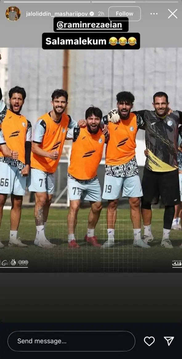 در این دیدار رقابت جالبی بین دو تیم تمرینی شکل گرفت. جلال الدین مشاریپوف در یک سمت میدان و رامین رضاییان در سمت دیگر میدان حضور داشتند. این بازی درون تیمی که همیشه با دیدارهای دوستانه همراه است با برتری شاگردان رضاییان به پایان رسید. رضاییان پس از پایان تمرین، تصویری از تیم برنده منتشر کرد و مشاریپوف را تگ کرد و چند روز پیش با نوشتن عبارت «علیکم السلام» پاسخی طنز به کری داد. ماجرا از آنجا شروع شد که مشاریپوف چند روز پیش تصویری از تیم برنده تمرینی منتشر کرد و رضاییان را تگ کرد و نوشت: سلام علیکم.