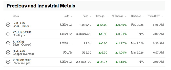 هر اونس طلا امروز با ۹ دلار و ۵۶ سنت افزایش به ۴۴۹۴.۰۳ دلار رسید. نقره نیز با ۷۲.۷۰ دلار در هر اونس و پلاتین ۲۳۷۷.۵۰ دلار در هر اونس رکورد را شکست. پالادیوم ۳ درصد افزایش یافت و به ۱۹۱۹ دلار و ۱۷ سنت رسید که بالاترین میزان در سه سال اخیر است.