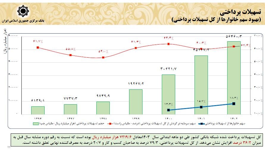 آمارها حاکی از آن است که شبکه بانکی گام موثری در جهت ارتقای سهم خانوارها از کل تسهیلات پرداختی برداشته است، بنابراین علاوه بر تسهیل در پرداخت این تسهیلات، می توان رشد وام در این حوزه را نیز مشاهده کرد که سهم خانوارهای این منطقه در سال ۱۴۰۰ با افزایش ۵ درصدی از سهم خانوارهای ۱۳.۳ درصدی فراتر رفته و علیرغم محدودیت گزینههای پرداخت برای کل شبکه بانکی، سود پرداختی به خانوارها در سال ۱۴۰۲ نسبت به سال ۱۴۰۱ با رشد ۴۵ درصدی است. ۶ درصد
