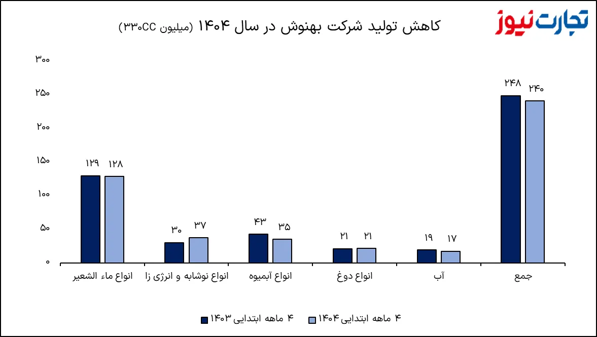 شرکت Behnoush -iran در چهار ماه اول سال با افت تولید سه درصد و کاهش پنج درصد ، با گردش مالی عملیاتی ۵ درصد افزایش یافت. این تضاد بین کاهش فروش و پرش فروش به دلیل افزایش نرخ فروش و تورم مواد غذایی است.
