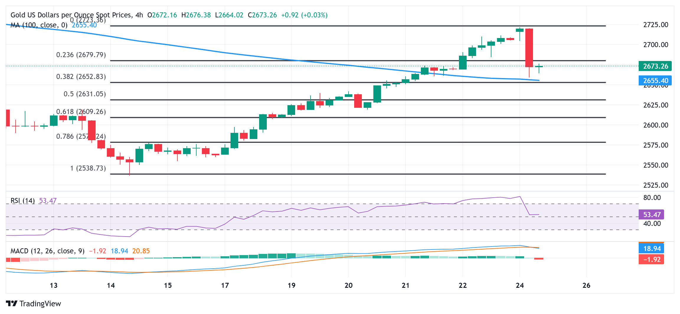 در حال حاضر، قیمت طلا زیر سطح ۲۳.۶ درصد فیب معامله می شود و بیشترین کاهش خود را از ۱۴ نوامبر تاکنون داشته است. علاوه بر این، کاهش اخیر قیمت آن را به سطح SMA 100 روزه در منطقه ۲۶۶۰ دلار نزدیک کرده است. در حالی که نوسانگرهای ۴ ساعته بازگشت طلا از روند نزولی عمیق روز قبل را نشان می دهد، روند قیمت به دلایل اساسی که در بالا ذکر شد به نزول و کاهش ادامه می دهد.