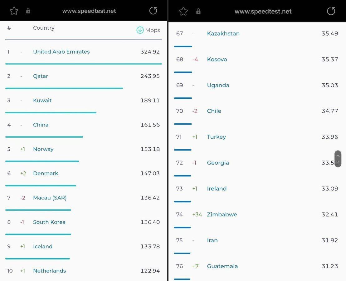 در رتبه بندی Speed Test کشورهای دارای بالاترین میانگین سرعت اینترنت موبایل در نوامبر ۲۰۲۳، جایگاه ۴ کشور اول لیست نسبت به ماه قبل تغییری نکرده است. به این ترتیب امارات متحده عربی با میانگین سرعت ۳۲۴.۹۲ مگابیت بر ثانیه در رتبه اول قرار دارد. پس از آن قطر (۲۴۳.۹۵ مگابیت بر ثانیه)، کویت (۱۸۹.۱۱ مگابیت بر ثانیه) و چین (۱۶۱.۵۶ مگابیت بر ثانیه) به ترتیب در رده های دوم، سوم و چهارم قرار دارند.