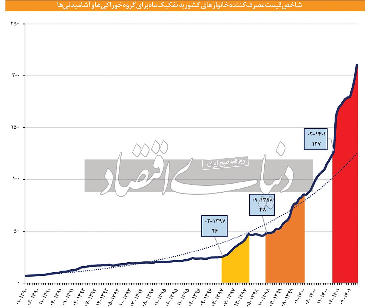 نمودار این مقاله روند افزایشی مستمر شاخص قیمت مصرف کننده گروه مواد غذایی و آشامیدنی را برای کشور طی دوره زمانی ۱۴۰۲ تا ۱۳۹۰ نشان می دهد. سه نقطه نشان داده شده در این نمودار هر کدام مربوط به از سرگیری تحریم های جهانی است (اردیبهشت ۲۰۱۷، شیوع ویروس کرونا (آذر ۲۰۱۸) و حذف ارز ترجیحی (اردیبهشت ۱۴۰۱) که هر یک به نوعی باعث افزایش قیمت مواد غذایی در سبد مصرف خانوارهای کشور شد. اعداد شاخص در این ماه ها به ترتیب ۲۶، ۴۸ و ۱۲۷ بوده است.
