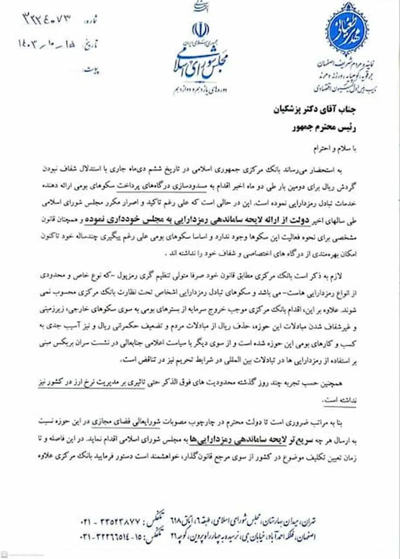 لذا لازم است دولت محترم در چارچوب مصوبات شورای عالی فضای مجازی در این زمینه، لایحه ساماندهی دارایی های رمزنگاری شده را در اسرع وقت تقدیم شورای اسلامی کند. در این میان و تا زمان قطعی شدن موضوع در کشور از سوی مرجع مقننه، خواهشمند است علاوه بر محدودیت فوری و کامل درگاهها و حسابهای صرافیهای داخلی ارزهای دیجیتال، به بانک مرکزی دستور دهد تا از اعمال فشار بر شرکتهای داخلی خودداری کند. پلتفرم های خارجی، با استفاده نکردن از ابزار برای بستن پورت ها و حساب ها.