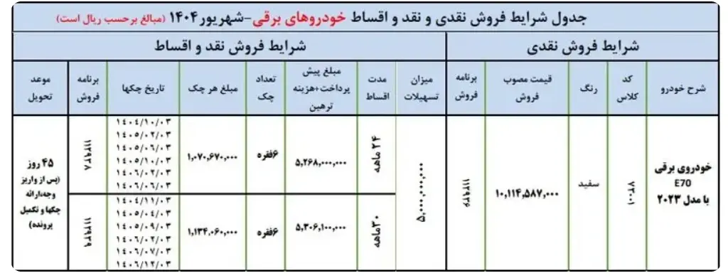 در فروردین ۱۴۰۴ جایزه صفر Dongfeng E70 توسط شرکت ایران Khodro 1،۰۰۹،۳۹۴،۰۰۰ اعلام شد. این شرکت در ۹ ژوئیه سال جاری ۱،۰۱۰،۵۰۰،۰۰۰ به عنوان قیمت جدید برای ماشین برقی ، سپس قیمت نهایی در برنامه قبل از فروش اعلام کرد شهریور ماه برای خرید ۱،۰۱۱،۴۵۸،۷۰۰ دلار اعلام شد.