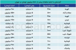 براساس تجارت اخبار ، امتحان وام مسکن و آپارتمان در مناطق شمالی تهران نشان داده شده است که اجاره ماهانه برخی از واحدهای منطقه به بیش از نیمی از میلیارد میلیارد تومن رسیده است. به عنوان مثال ، در سه ماهه زعفران برای ویلا با ۲ متر مربع زیرساخت و ۲ سال ، ۲ میلیارد وام مسکن و ۲ میلیون اجاره ماهانه Tomans تبلیغ شد.