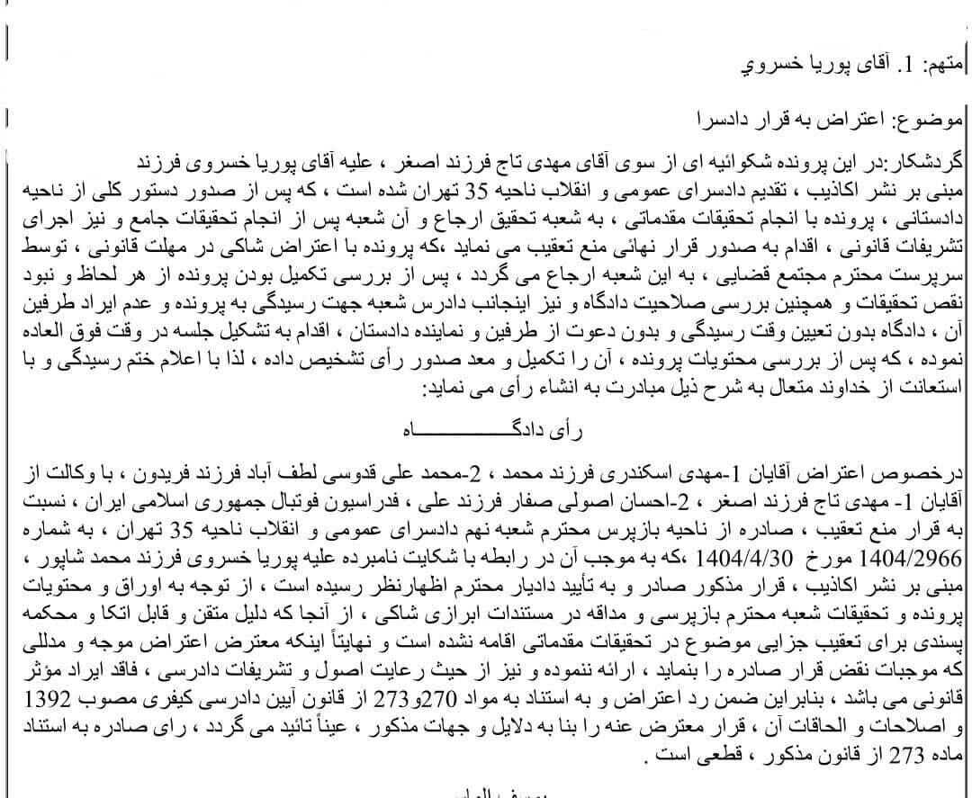 پس از بررسی و تکمیل پرونده ، دادگاه جلسه دادرسی و دعوت را به طرفین منصوب کرد. پس از شنیدن اظهارات و تحقیقات طرفین ، دادگاه شکایت مهدی تاج را رد کرد و ممنوعیت دادستان پوریا خسرووی صادر شد که در آن مهدی تاج به دادگاه اعتراض کرد.