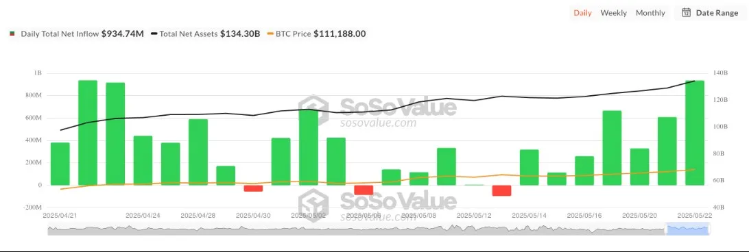 دیروز ، بیش از ۹۳۴.۱۷ میلیون دلار ، بالاترین ورودی یک روز از ۲۱ آوریل ، از ETF Bitcoin وارد جعبه های ETF شد. به گفته Sosive ، این روز هفتم پشت سر هم بود که جریان ورود به این وسایل مثبت بود. این سیگنال برای افزایش اعتماد سرمایه گذاران نهادی در بازار است. عملکرد مثبت قیمت بیت کوین در این هفته به عنوان یک کاتالیزور برای علاقه به ETF عمل کرده است و می تواند نشانه ای از جذابیت پایداری طولانی مدت برای این بازار باشد.