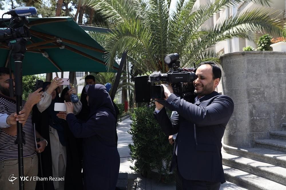 جمعی از اعضای هیات دولت، روز چهارشنبه (۲۶ اردیبهشت ۱۴۰۳) پس از جلسه در محل نهاد ریاست جمهوری با حضور خبرنگاران و پاسخگویی به سوالات آنان. در حاشیه این مراسم بهادری جهرمی سخنگوی دولت دوربین یکی از اصحاب رسانه را گرفت.