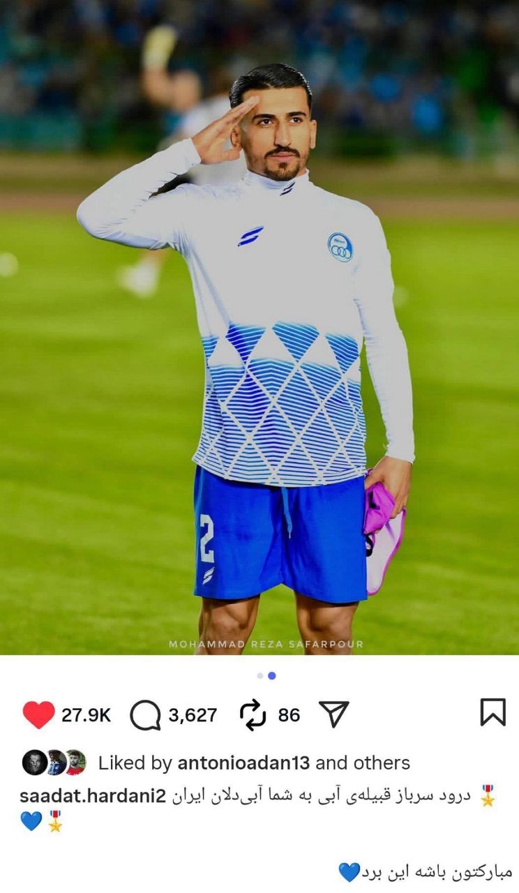 «هردانی» در این پست نوشت: درود بر تو ای دل آبی سرباز ایل آبی. حردانی با تبریک این پیروزی نوشت: این پیروزی را تبریک می گویم.