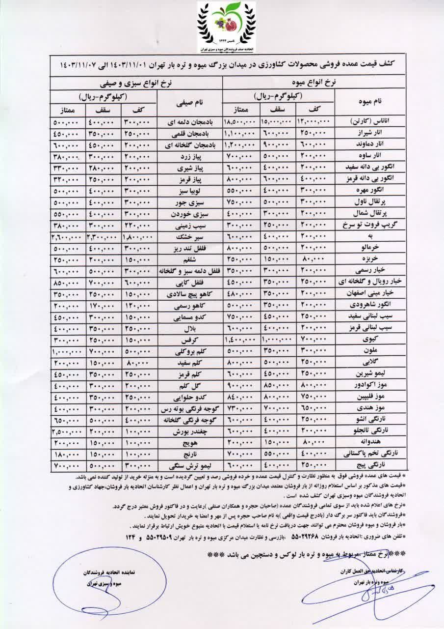 جدول قیمت عمده فروشی محصولات کشاورزی در میدان میوه و تره بار تهران در زیر آمده است.