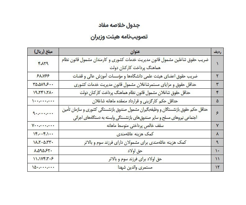 در این مصوبه علاوه بر ضریب حقوق شاغلان و بازنشستگان، مبالغ حداقل حقوق و مزایای مستمر، حداقل حکم استخدامی و میانگین ماهانه سقف خالص خالص پرداختی کارکنان نیز مشخص شده است.