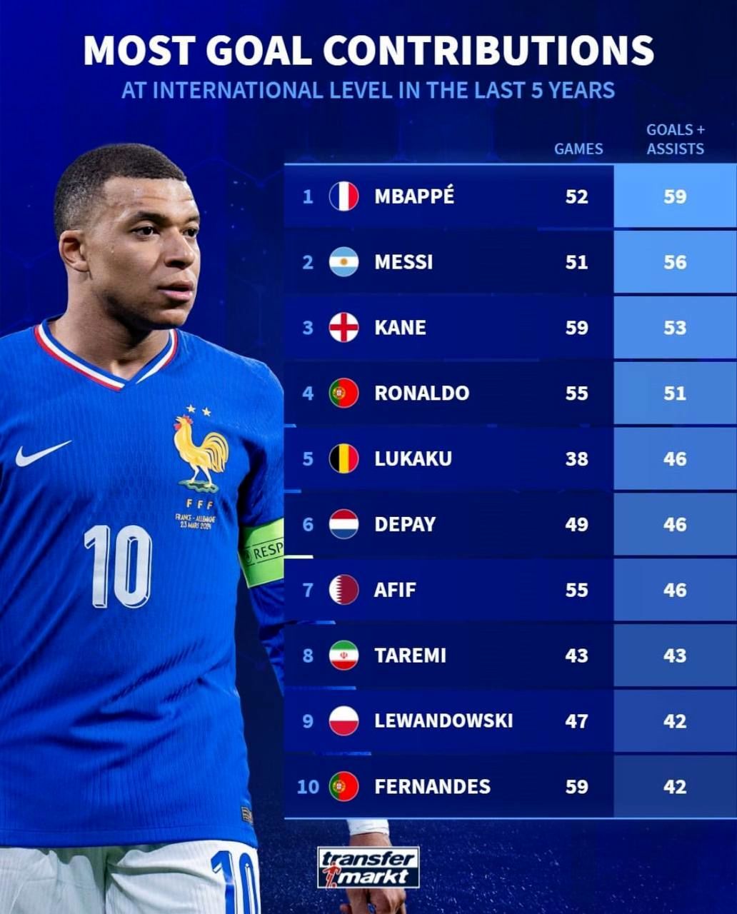کیلیان امباپه، لیونل مسی، هری کین، کریستیانو رونالدو و روملو لوکاکو ۵ نفر اول این لیست هستند.