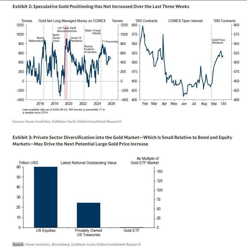 در بخش دیگری از این گزارش آمده است که تنوع سرمایه گذاری های بخش خصوصی در جهت بازار طلا در مقایسه با بازار سهام و اوراق بهادار مالی هنوز بسیار کم است. برآورد گلدمن ساکس نشان می دهد که ارزش بازار سهام ایالات متحده حدود ۵ تریلیون دلار و بازار مالی حدود ۵ تریلیون دلار است ، در حالی که کل بازار طلا فقط بخش کوچکی از این تعداد است. این بانک معتقد است که اگر سهم طلا در نمونه کارها دارایی ها باعث افزایش سرمایه گذاران خصوصی شود ، احتمال موج بزرگ بعدی در طلا افزایش می یابد.