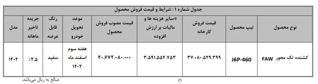 این شرکت FAWJ6P-460 FAWJ6P-460 را به صورت نقدی به فروش می رساند. این برنامه فروش از ساعت ۱۰ صبح در تاریخ دوم شروع می شود بهمن ماه تا شنبه، ۷، ۱۲ بعد از ظهر بهمن با مراجعه به نمایندگی های درج شده در سایت رسمی گروه بهمن مراحل خرید را ادامه دهید. سیبا موتور این محصولات را با مدل ۱۴۰۲ در هفته سوم اسفند به دست مشتریان خواهد رساند. قیمت مصوب سیبا موتور فاو ۴۶۰ در این فروش حدود ۴ میلیارد و ۶۷ میلیون تومان است و تمامی این محصولات با رنگ سفید به خریداران تحویل داده می شود.